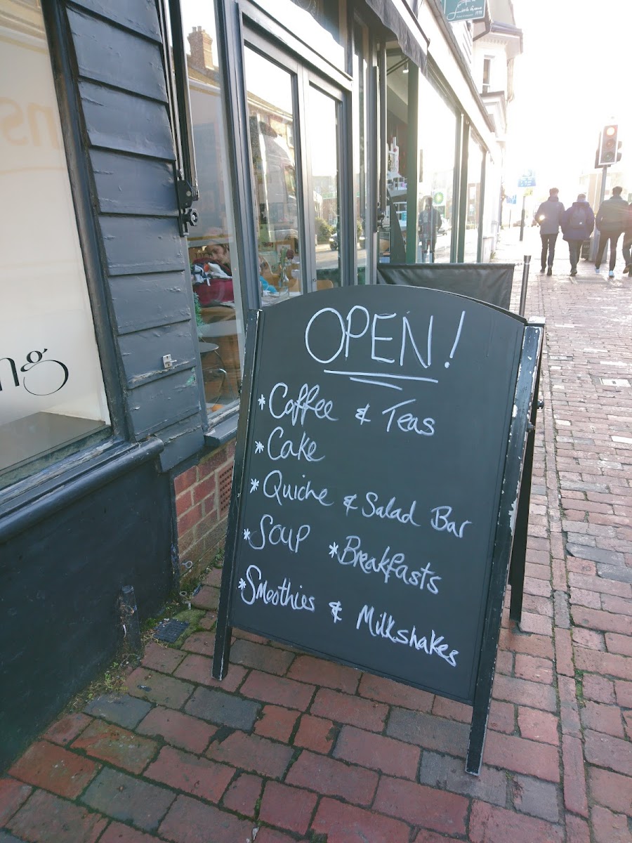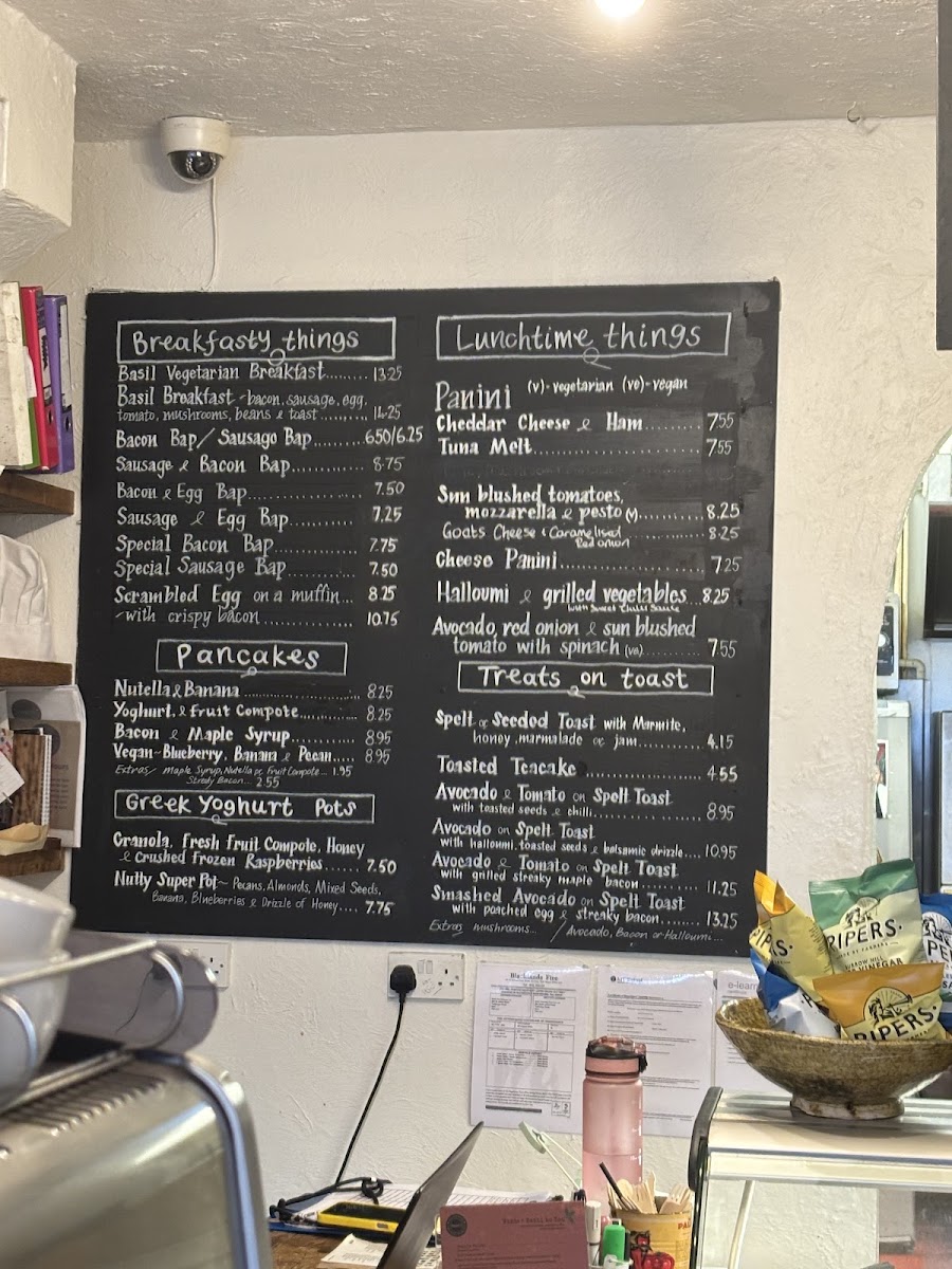 The menu at Basil Wholefoods offers a delightful variety of dishes that cater to different tastes and dietary preferences. For breakfast, guests can choose from options like the Basil Vegetarian Breakfast or the Basil Breakfast, perfect for those seeking a hearty start to their day. The Bacon Bap or Sausage Bap (priced at £6.50) are also popular choices, providing a savory, satisfying bite. For something lighter, the Toasted Teacake or Avocado on Spelt Toast are ideal picks, with variations like Smashed Avocado on Spelt Toast adding a fresh twist. The pancake section boasts indulgent options such as Nutella & Banana and Bacon & Maple Syrup, alongside a vegan-friendly Blueberry, Banana & Pecan pancake. Those seeking something healthier might enjoy the Nutty Super Pot Greek Yoghurt Pot. For drinks, Basil Wholefoods serves an array of beverages including Latte, Cappuccino, and Americano, as well as specialty teas like Earl Grey and Camomile. For lunch or a light snack, the menu features tasty sandwiches and paninis, such as the Cheddar Cheese & Ham, Tuna Melt, and the more adventurous Halloumi & Grilled Vegetables or Avocado, Red Onion & Sun Blushed Tomato with Spinach. With its varied offerings, Basil Wholefoods ensures there’s something for everyone, whether you're after a classic breakfast or a wholesome afternoon snack.